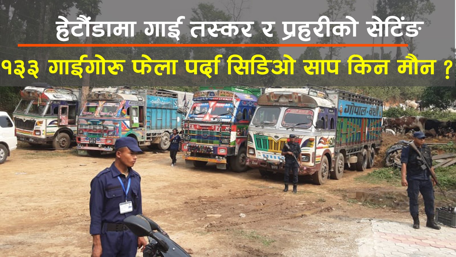 लु २ ख ७५७ ,लु २ ख ६०४,लु २ ख ६५५, लु २ ख ५९३ , नम्बरको ४ वटा ट्रकमा लुम्बिनीको रुपन्देहीबाट ल्याईएको १ सय ३३ वटा गाईगोरु हेटौंडामा फेला परेपनि प्रहरीलेले वास्तै नगरी छाडेका छन् ।